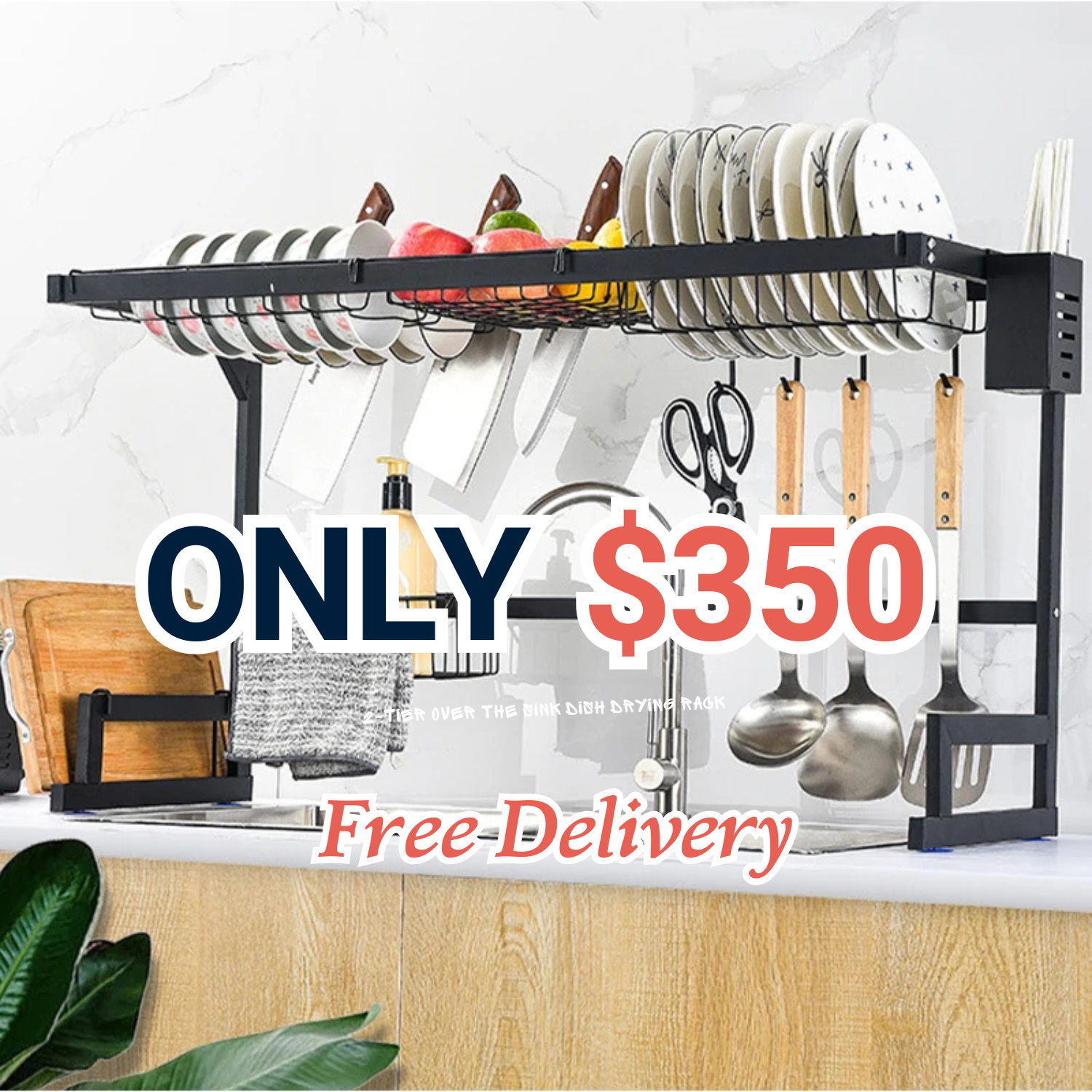 Transform your kitchen counter with the ultimate organization tool — the 2-Tier Over-the-Sink Dish Drying Rack. This heavy-duty black steel rack sits right over your sink, maximizing every inch of counter space while keeping dishes, pots, utensils, and cutting boards neatly organized and drip-drying right where they should be. With multiple hooks for hanging ladles, spatulas, and knives, plus a generous top shelf for plates and a lower level for bowls, this rack does the work of an entire kitchen cabinet. Built tough, rust-resistant, and absolutely worth every cent — and it comes with free delivery!