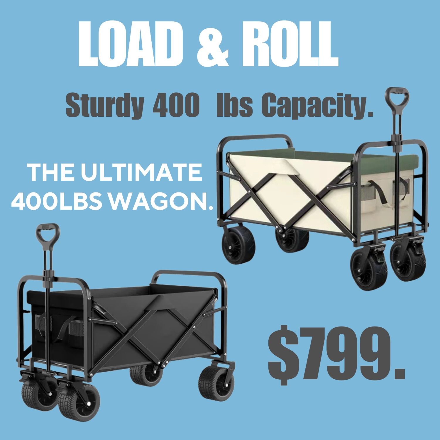 Work harder, carry more, and go anywhere with the Load & Roll Ultimate 400 lbs Folding Wagon — the heavy-duty outdoor companion built for people who mean business. With a massive 400-pound weight capacity and all-terrain wheels that roll effortlessly over grass, gravel, sand, and pavement, this wagon tackles any job you throw at it. Available in sleek black and olive green, the sturdy steel frame folds flat in seconds for easy storage and transport — no tools required. Whether you’re hauling gear to a campsite, moving supplies at a market, or loading up at the beach, this wagon does the heavy lifting so you don’t have to.