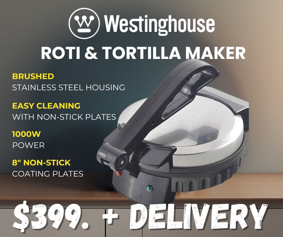 The Westinghouse Electric Corporation Roti & Tortilla Maker is a compact kitchen appliance designed to quickly cook fresh rotis, tortillas, and flatbreads. It features a durable brushed stainless-steel body, 8-inch non-stick plates for easy cooking and cleaning, and 1000W power for fast heating. The simple press design helps make evenly cooked rotis in minutes, making it convenient for everyday home use.