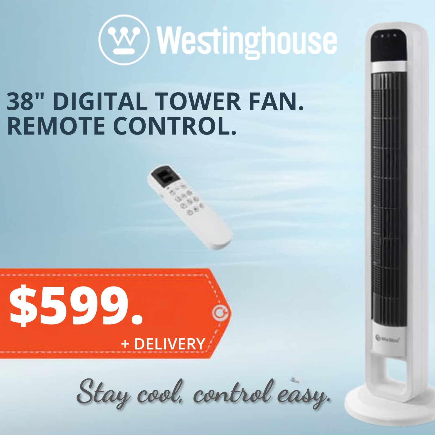Beat the heat in style with the Westinghouse 38″ Digital Tower Fan — powerful, whisper-quiet, and completely in your control. Standing tall at 38 inches, this sleek white tower fan delivers a wide, consistent breeze that cools your entire room evenly. The digital display and full-function remote control put complete comfort at your fingertips — adjust speed, set a timer, and switch modes without leaving your seat. Whether it’s for your bedroom, living room, or home office, this fan combines powerful performance with a clean, modern aesthetic that elevates any space.